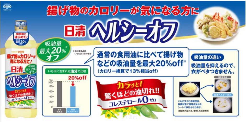 圖:日清抑制吸油量調和油 (主要成分菜籽油、大豆油),可減少油炸食品的卡路里